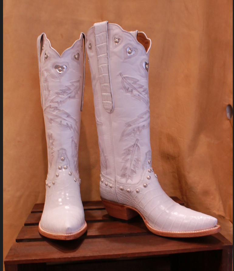 All White Kangaroo with Stitching Feathers and Hearts Sterling Silver Peyote Buttons with Alligator Bottoms Tres Outlaws Women's Classic Tall Boot