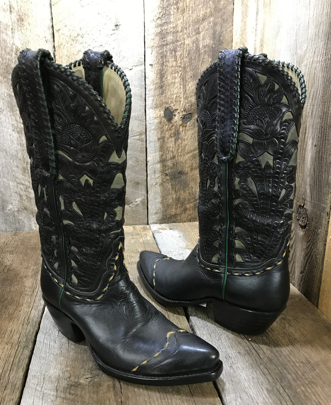 Black Kangaroo Calf Wing Tips Tooled Falconhead Women's Classic Boot 1339 *