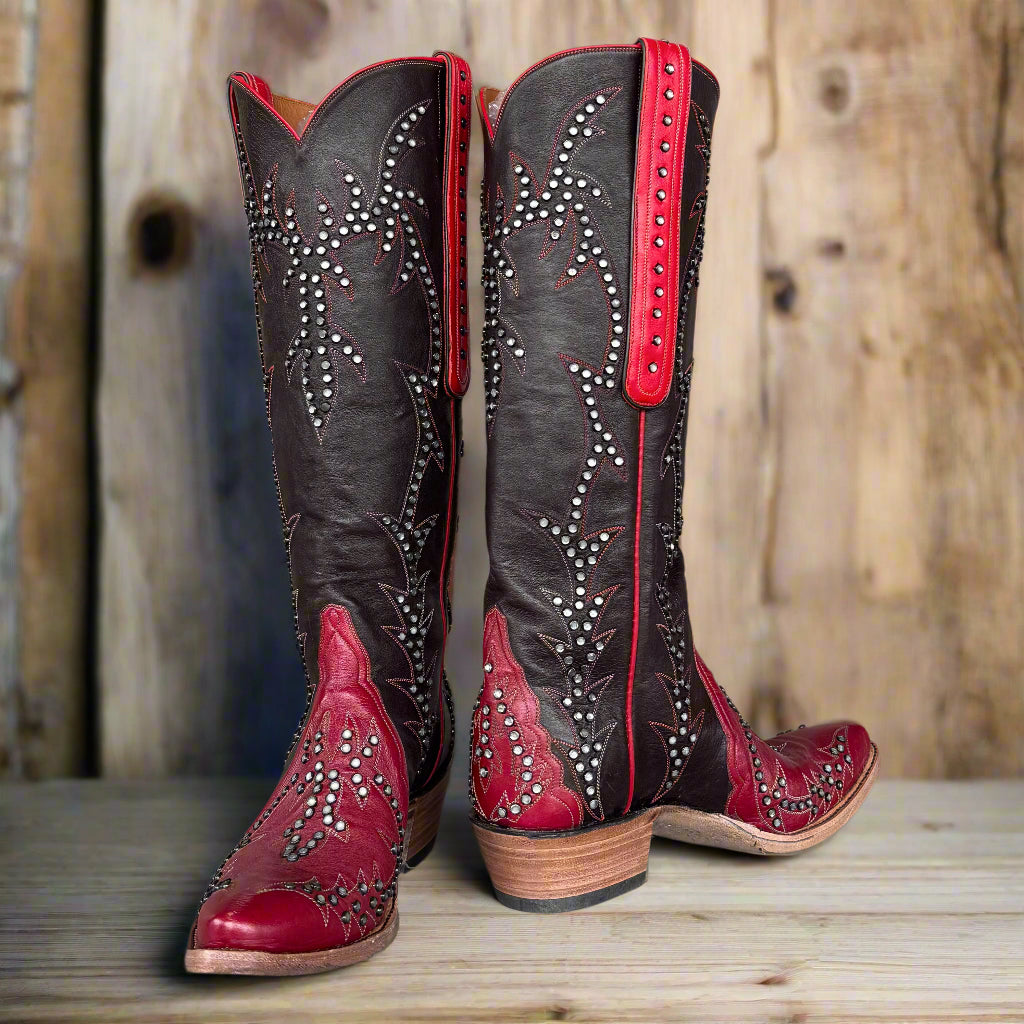 Stardust 7 Dark Red and Black Kangaroo Tres Outlaws Women's Classic Tall Boot. Featuring 912 Light Grey Opal Swarovski Crystals!
