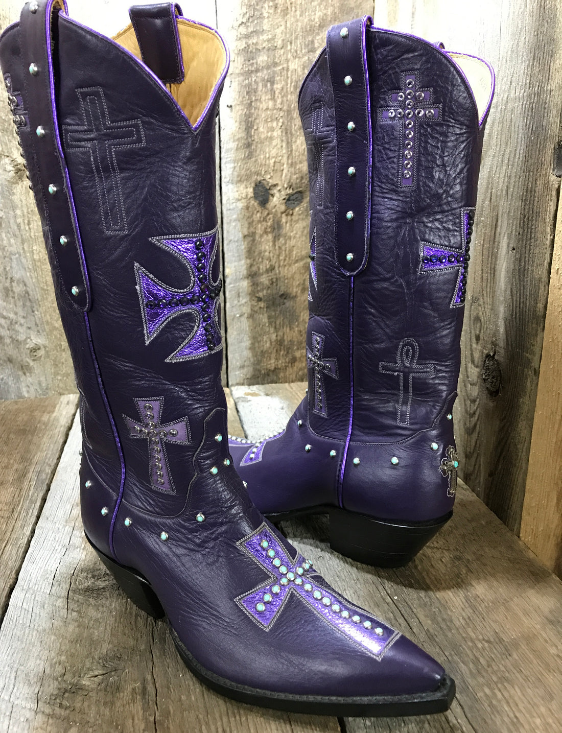 "Ultimate Purple Cross" Swarovski Crystals with Genuine Sterling Silver Heel Cover Tres Outlaws Women's Classic Boot